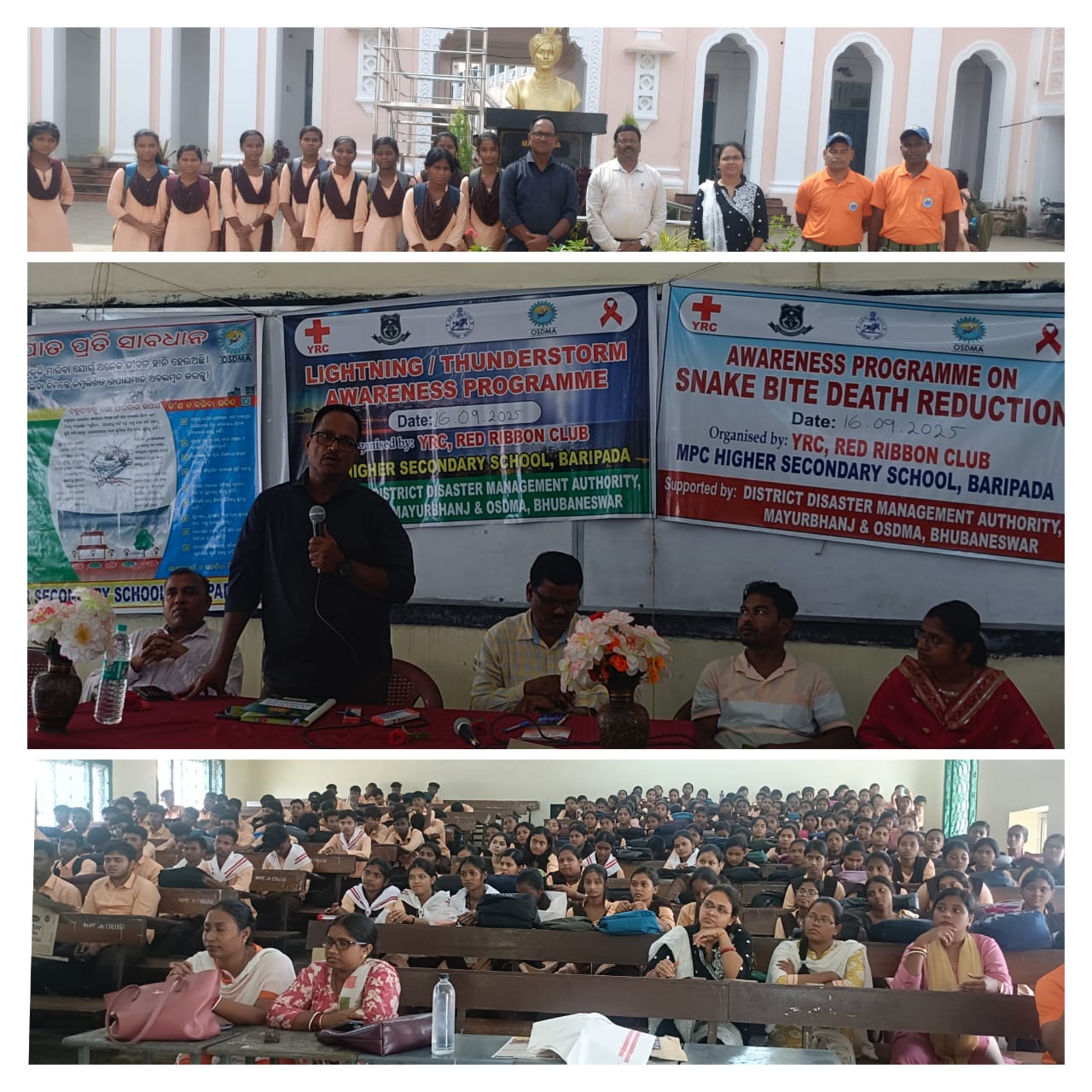 ବାରିପଦା -ତା -17-09-2025-ମହାରାଜା ପୂର୍ଣଚନ୍ଦ୍ର ଉଚ୍ଚ ମାଧ୍ୟମିକ ବିଦ୍ୟାଳୟ ସଭା କକ୍ଷ୍ୟରେ ଓଡ଼ିଶା ରାଜ୍ୟ ବିପର୍ଯ୍ୟୟ ପରିଚାଳନା କର୍ତ୍ତୃପକ୍ଷ, ଭୁବନେଶ୍ୱର ଓ ଜିଲ୍ଲା ବିପର୍ଯ୍ୟୟ ପରିଚାଳନା କର୍ତ୍ତୃପକ୍ଷ, ମୟୁରଭଞ୍ଜ ସହାୟତାରେ “ସାପ କାମୁଡା ଜନିତ ମୃତ୍ୟୁ ନିରାକରଣ ଓ ବିଜୁଳୀ ଘଡ଼ଘଡ଼ି ସଚେତନତା କାର୍ଯ୍ୟକ୍ରମ” ଅଧ୍ୟକ୍ଷ ଶ୍ରୀ ଉପେନ୍ଦ୍ର କୁମାର ମାଝୀଙ୍କ ପୌରହିତ୍ୟରେ ଆୟୋଜିତ ହୋଇଥିଲା।